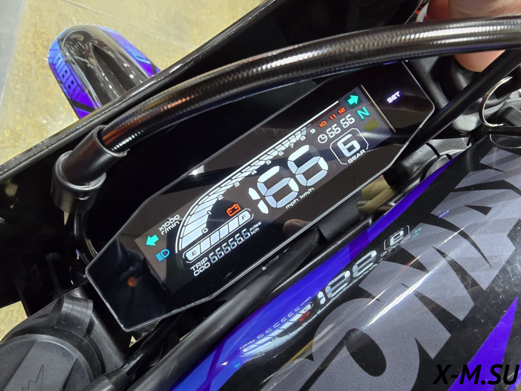 Многофункциональная приборная панель со спидометром, тахометром, одометром, индикатором передач и заряда батареи. Влагозащитные разъемы подключения приборной панели, блоков управления и кнопок старт/стоп.