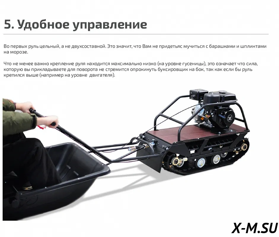 На транспорте установлен монолитный руль, обеспечивающий более прочное и надежное соединение с механизмами мотобуксировщика (например, с барашками и шплинтами). Это способствует жесткости и надежности оборудования, особенно важно это в условиях повышенной нагрузки. Крепление руля находится на уровне гусеницы, что устраняет вероятность опрокидывания буксировщика на бок.